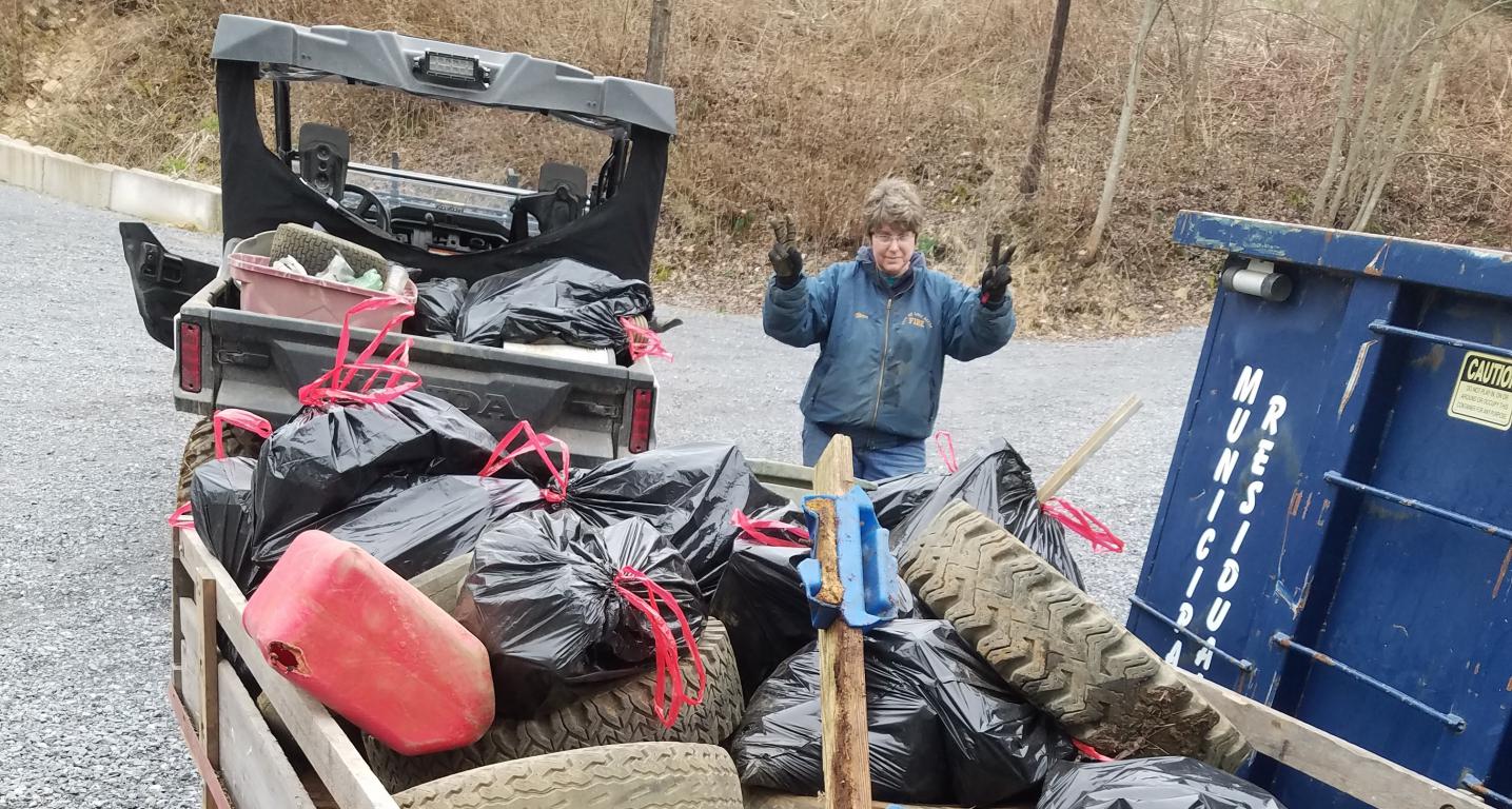 Photo: Here West Branch property owner and river champion Beth Bason is celebrating the last load collected from a previous floodplain cleanup in early spring. The July 27 Bald Eagle Creek cleanup needs drivers with trucks or trailers. Volunteers will load the bed, and drivers transport the tires to the nearby roll-off dumpster.