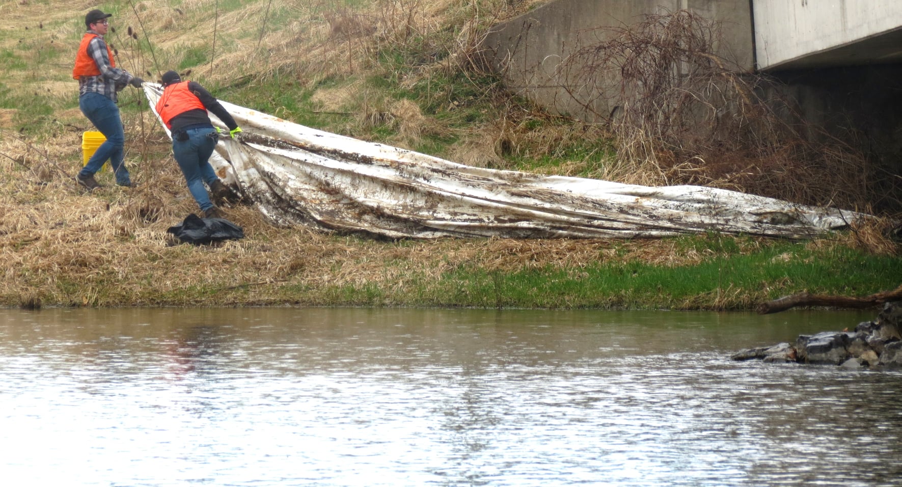 Photo: Starting time rain followed by 12 noon pelting hail was no match for the CleanScapes volunteers. Together they cleaned up miles of creekbank and roadsides for opening day fishing and festivities. In total, 62 volunteers collected almost 1, 500 lbs. of litter in 3 hours. In addition, and to help declining monarch butterfly numbers and in support of Ukraine, volunteers spread common milkweed and sunflower seeds on the creekbank. Milkweed seeds were donated by milkweedmonarchy.com and sunflower seeds from Chatham Run Feed Mill. For more photos from this event, click here.