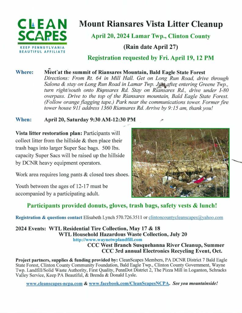 The Mount Riansares Vista Litter Cleanup is Saturday, April 20, 2024, in Lamar Township, Clinton County. The cleanup will take place between 9:30 AM and 12:30 PM. All volunteers should arrive by 9:15 AM.