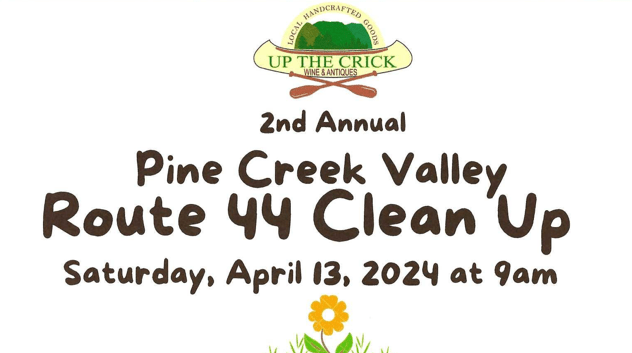 A cleanup is planned for Sunday, April 16, 2023 on Route 44 North in Pine Creek Valley, and volunteers are invited to get involved. Pre-register by April 13.